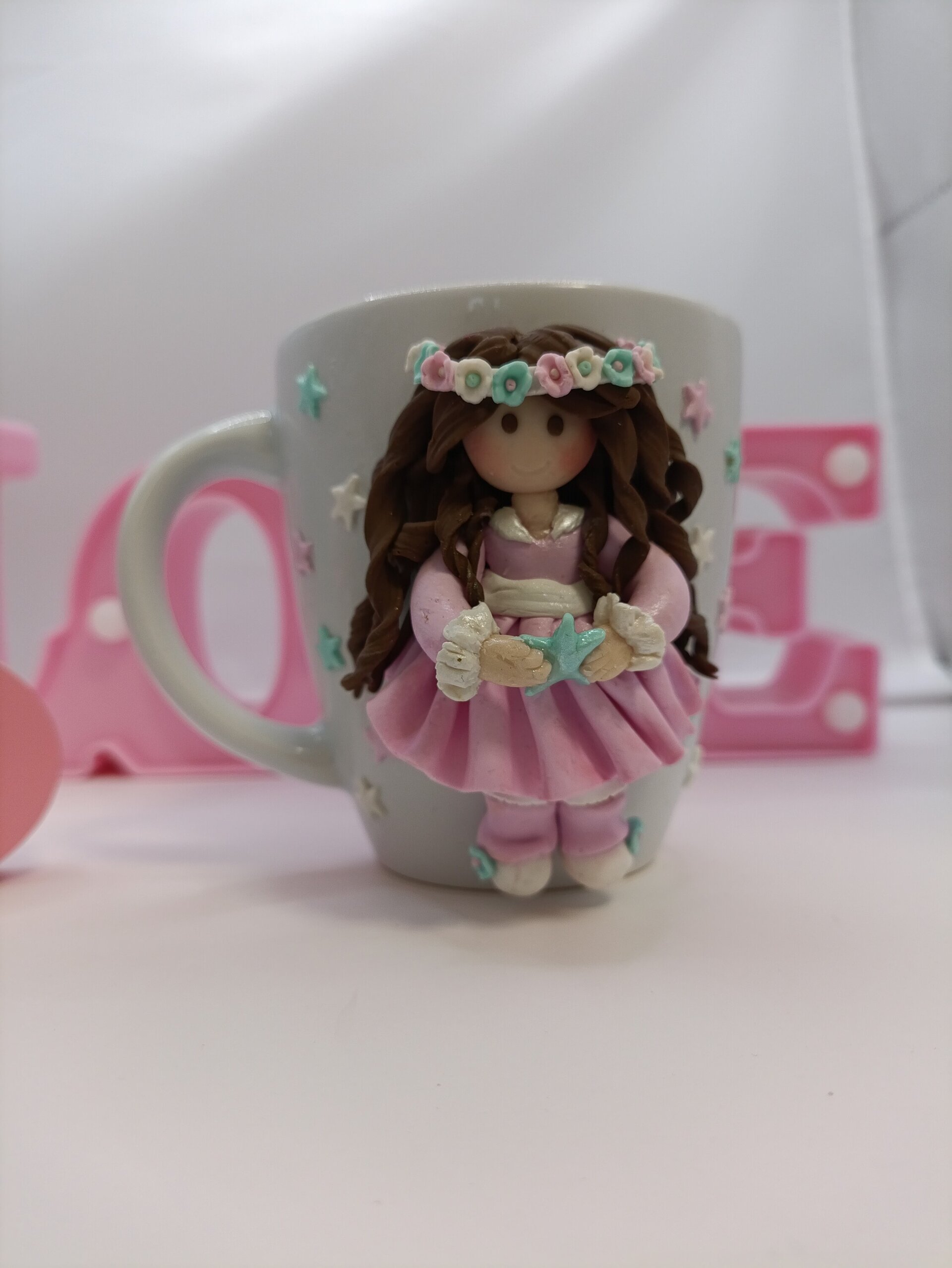¡Prepárate para una taza que te hará sonreír cada mañana! Esta taza personalizada está hecha con arcilla polimérica y luce un diseño adorable de una muñeca con una estrella. Pero espera, ¡hay más! En la parte de atrás, ¡te pondremos tu nombre para que sepas que esta taza es solo